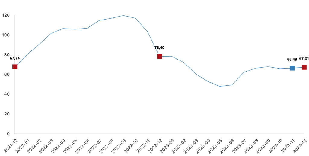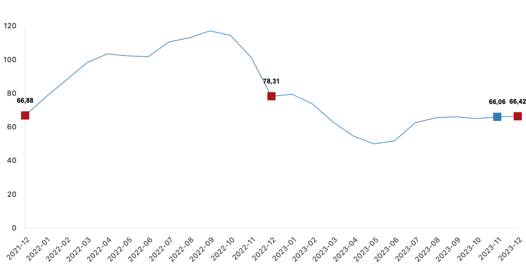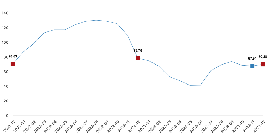 İnşaat maliyet endeksi, 2023 yılı Aralık ayında bir önceki aya göre %1,94 arttı, bir önceki yılın aynı ayına göre %67,31 arttı. Bir önceki aya göre malzeme endeksi %2,05 arttı, işçilik endeksi %1,67 arttı. Ayrıca bir önceki yılın aynı ayına göre malzeme endeksi %54,26 arttı, işçilik endeksi %111,83 arttı.