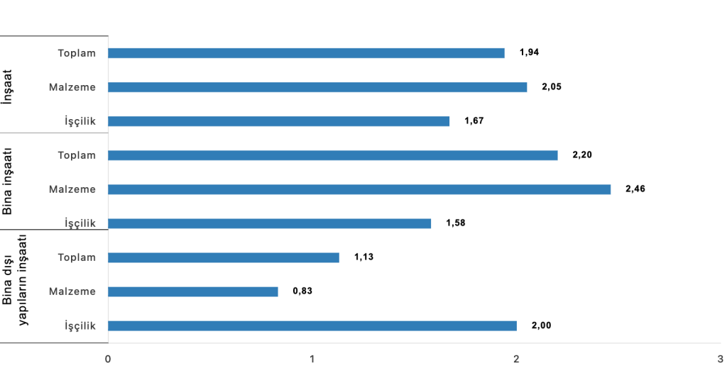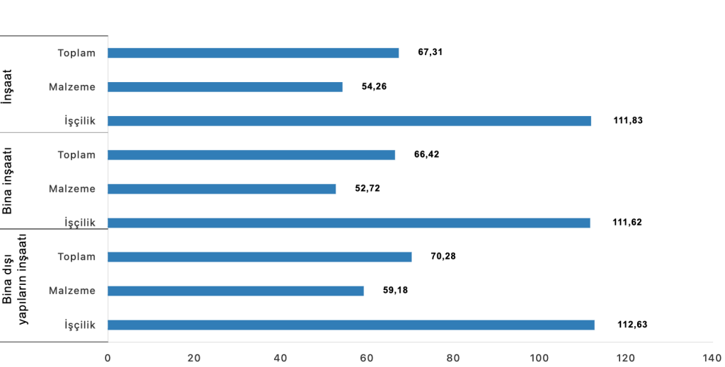 Bina dışı yapılar için inşaat maliyet endeksi, bir önceki aya göre %1,13 arttı, bir önceki yılın aynı ayına göre %70,28 arttı. Bir önceki aya göre malzeme endeksi %0,83 arttı, işçilik endeksi %2,00 arttı. Ayrıca bir önceki yılın aynı ayına göre malzeme endeksi %59,18 arttı, işçilik endeksi %112,63 arttı.