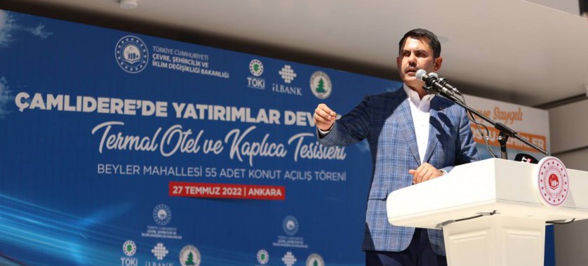 Çamlıdere Termal Otel ve Kaplıca Tesisleri ile Beyler Mahallesi 55 Konut Açılış Töreni ile bir dizi ziyaretler için Çamlıdere’ye gelen Çevre, Şehircilik ve İklim Değişikliği Bakanı Murat Kurum, burada bir konuşma yaptı.