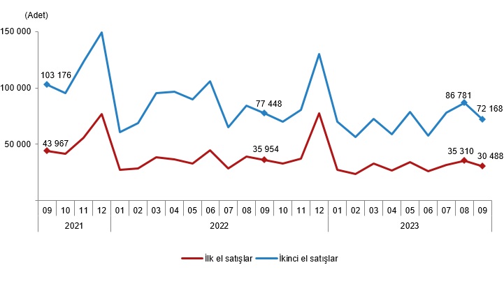 Türkiye genelinde ikinci el konut satışları Eylül ayında bir önceki yılın aynı ayına göre %6,8 azalış göstererek 72 bin 168 oldu. Toplam konut satışları içinde ikinci el konut satışının payı %70,3 oldu. İkinci el konut satışları Ocak-Eylül döneminde ise bir önceki yılın aynı dönemine göre %15,2 azalışla 631 bin 477 olarak gerçekleşti.