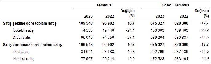 Türkiye genelinde ikinci el konut satışları Temmuz ayında bir önceki yılın aynı ayına göre %19,5 artış göstererek 77 bin 907 oldu. Toplam konut satışları içinde ikinci el konut satışının payı %71,1 oldu. İkinci el konut satışları Ocak-Temmuz döneminde ise bir önceki yılın aynı dönemine göre %19,0 azalışla 472 bin 528 olarak gerçekleşti.
