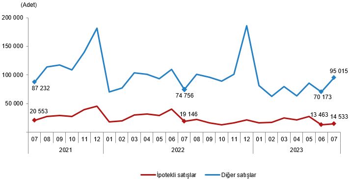 Türkiye genelinde diğer konut satışları Temmuz ayında bir önceki yılın aynı ayına göre %27,1 artarak 95 bin 15 oldu. Toplam konut satışları içinde diğer satışların payı %86,7 olarak gerçekleşti. Ocak-Temmuz döneminde gerçekleşen diğer konut satışları ise bir önceki yılın aynı dönemine göre %14,5 azalışla 539 bin 264 oldu.