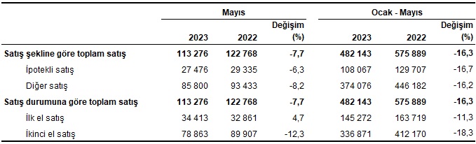 Türkiye genelinde ikinci el konut satışları Mayıs ayında bir önceki yılın aynı ayına göre %12,3 azalış göstererek 78 bin 863 oldu. Toplam konut satışları içinde ikinci el konut satışının payı %69,6 oldu. İkinci el konut satışları Ocak-Mayıs döneminde ise bir önceki yılın aynı dönemine göre %18,3 azalışla 336 bin 871 olarak gerçekleşti.