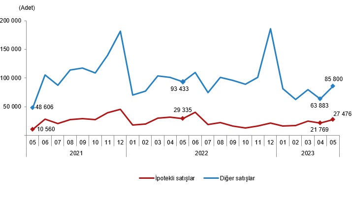 Türkiye genelinde ipotekli konut satışları Mayıs ayında bir önceki yılın aynı ayına göre %6,3 azalış göstererek 27 bin 476 oldu. Toplam konut satışları içinde ipotekli satışların payı %24,3 olarak gerçekleşti. Ocak-Mayıs döneminde gerçekleşen ipotekli konut satışları ise bir önceki yılın aynı dönemine göre %16,7 azalışla 108 bin 67 oldu.