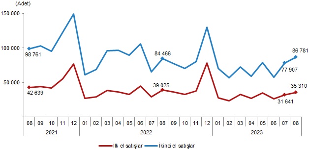 Türkiye genelinde ikinci el konut satışları Ağustos ayında bir önceki yılın aynı ayına göre %2,7 artış göstererek 86 bin 781 oldu. Toplam konut satışları içinde ikinci el konut satışının payı %71,1 oldu. İkinci el konut satışları Ocak-Ağustos döneminde ise bir önceki yılın aynı dönemine göre %16,2 azalışla 559 bin 309 olarak gerçekleşti.
